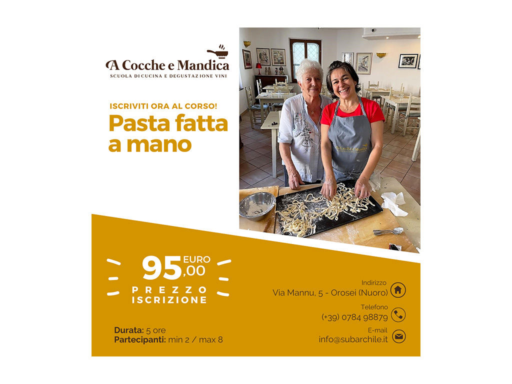 Un corso per imparare l’antica arte nella produzione della tipica pasta italiana, svolto in una cucina privata. Scoprirai tutti i segreti per ricreare tre iconiche ricette di pasta fatta a mano, tra cui ravioli, tagliatelle e tortelli, inclusa una salsa a base di pomodoro fresco. Il laboratorio prevederà una piacevole conclusione: tutti i partecipanti a tavola per gustare le proprie creazioni, sorseggiando un vino biologico sardo, imbottigliato e prodotto localmente.